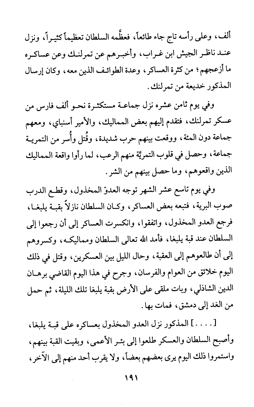 ألف، وعلى رأسه تاج جاء طائعًا، فعظَّمه السلطان تعظيمًا كثيرًا، ونزل عند ناظر الجيش ابن غراب، وأخبرهم عن تمرلنك وعن عساكره ما أزعجهم؛ من كثرة العساكر، وعدة الطوائف الذين معه، وكان إرسال المذكور خديعة من تمرلنك.
