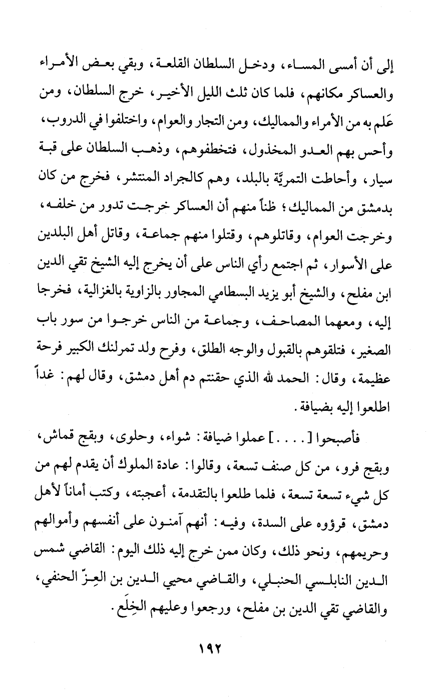 إلى أن أمسى المساء، ودخل السلطان القلعة، وبقي بعض الأمراء والعساكر مكانهم، فلما كان ثلث الليل الأخير، خرج السلطان، ومن عَلم به من الأمراء والمماليك، ومن التجار والعوام، واختلفوا في الدروب، وأحس بهم العدو المخذول، فتخطفوهم، وذهب السلطان على قبة سيار، وأحاطت التمريَّة بالبلد، وهم كالجراد المنتشر، فخرج من كان بدمشق من المماليك؛ ظنًا منهم أن العساكر خرجت تدور من خلفه، وخرجت العوام، وقاتلوهم، وقتلوا منهم جماعة، وقاتل أهل البلدين على الأسوار، ثم اجتمع رأي الناس على أن يخرج إليه الشيخ تقي الدين ابن مفلح، والشيخ أبو يزيد البسطامي المجاور بالزاوية بالغزالية، فخرجا إليه، ومعهما المصاحف، وجماعة من الناس خرجوا من سور باب الصغير، فتلقوهم بالقبول والوجه الطلق، وفرح ولد تمرلنك الكبير فرحة عظيمة، وقال: الحمد لله الذي حقنتم دم أهل دمشق، وقال لهم: غدًا اطلعوا إليه بضيافة.