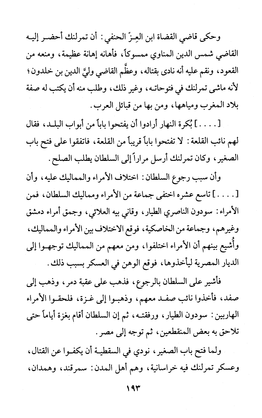 [ ... ] بُكرة النهار أرادوا أن يفتحوا بابًا من أبواب البلد، فقال لهم نائب القلعة: لا تفتحوا بابًا قريبًا من القلعة، فاتفقوا على فتح باب الصغير، وكان تمرلنك أرسل مرارًا إلى السلطان يطلب الصلح.