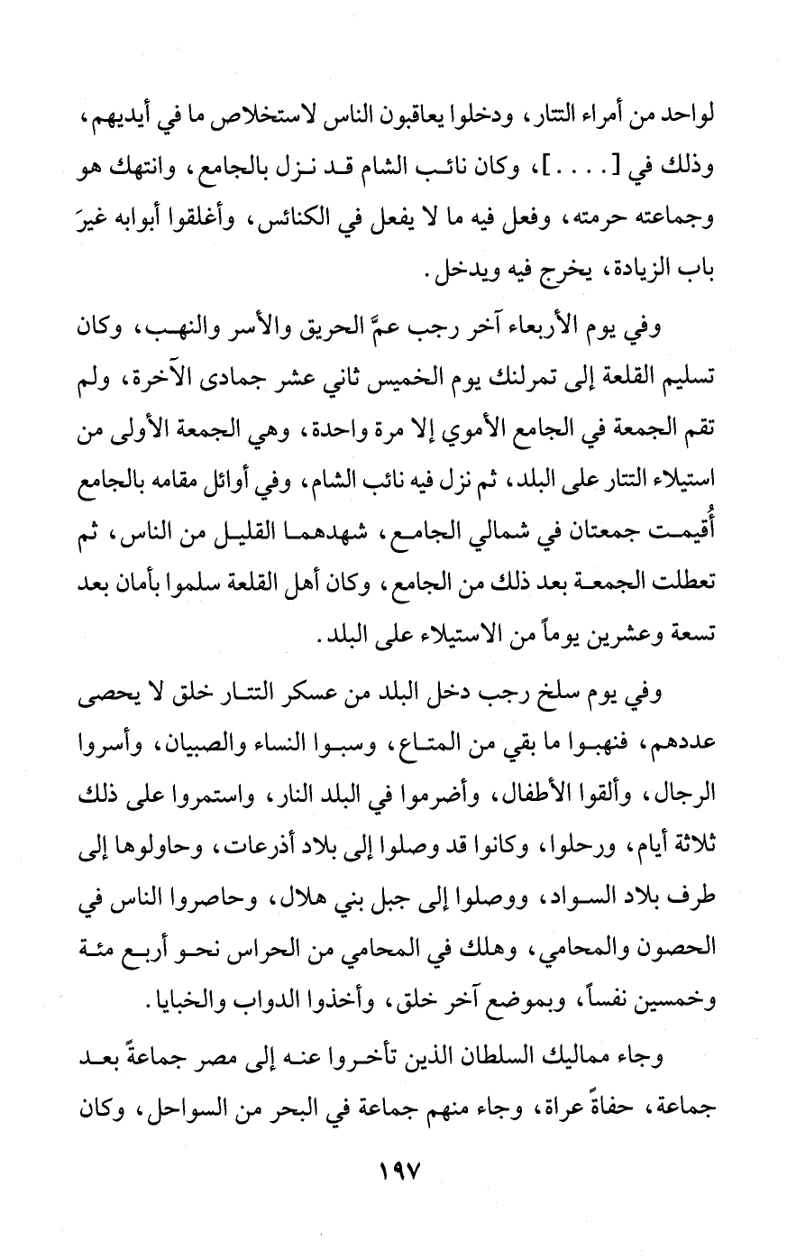 وفي يوم الأربعاء آخر رجب عمَّ الحريق والأسر والنهب، وكان تسليم القلعة إلى تمرلنك يوم الخميس ثاني عشر جمادى الآخرة، ولم تقم الجمعة في الجامع الأموي إلا مرة واحدة، وهي الجمعة الأولى من استيلاء التتار على البلد، ثم نزل فيه نائب الشام، وفي أوائل مقامه بالجامع أُقيمت جمعتان في شمالي الجامع، شهدهما القليل من الناس، ثم تعطلت الجمعة بعد ذلك من الجامع، وكان أهل القلعة سلموا بأمان بعد تسعة وعشرين يومًا من الاستيلاء على البلد.