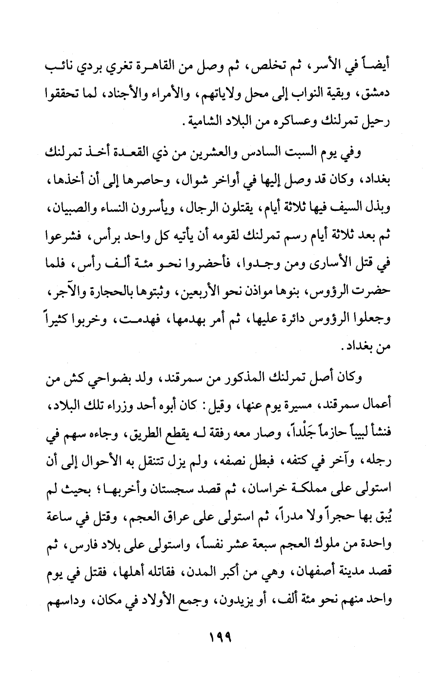 وفي يوم السبت السادس والعشرين من ذي القعدة أخذ تمرلنك بغداد، وكان قد وصل إليها في أواخر شوال، وحاصرها إلى أن أخذها، وبذل السيف فيها ثلاثة أيام، يقتلون الرجال، ويأسرون النساء والصبيان، ثم بعد ثلاثة أيام رسم تمرلنك لقومه أن يأتيه كل واحد برأس، فشرعوا في قتل الأسارى ومن وجدوا، فأحضروا نحو مئة ألف رأس، فلما حضرت الرؤوس، بنوها مواذن نحو الأربعين، وثبتوها بالحجارة والآجر، وجعلوا الرؤوس دائرة عليها، ثم أمر بهدمها، فهدمت، وخربوا كثيرًا من بغداد.