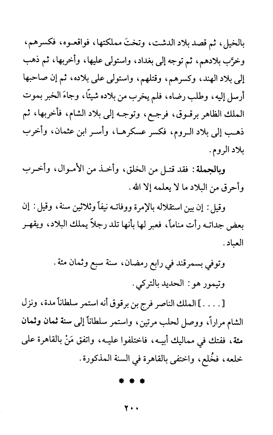 [ ... ] الملك الناصر فرج بن برقوق أنه استمر سلطانًا مدة، ونزل الشام مرارًا، ووصل لحلب مرتين، واستمر سلطانًا إلى سنة ثمان وثمان مئة، ففتك في مماليك أبيه، فاختلفوا عليه، واتفق مَنْ بالقاهرة على خلعه، فخُلع، واختفى بالقاهرة في السنة المذكورة.