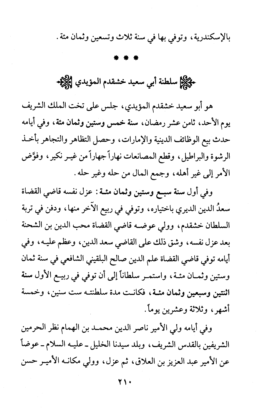 هو أبو سعيد خشقدم المؤيدي، جلس على تخت الملك الشريف يوم الأحد، ثامن عشر رمضان، سنة خمس وستين وثمان مئة، وفي أيامه حدث بيع الوظائف الدينية والإمارات، وحصل التظاهر والتجاهر بأخذ الرشوة والبراطيل، وقطع المصانعات نهاراً جهاراً من غير نكير، وفوَّض الأمر إلى غير أهله، وجمع المال من حله وغير حله.