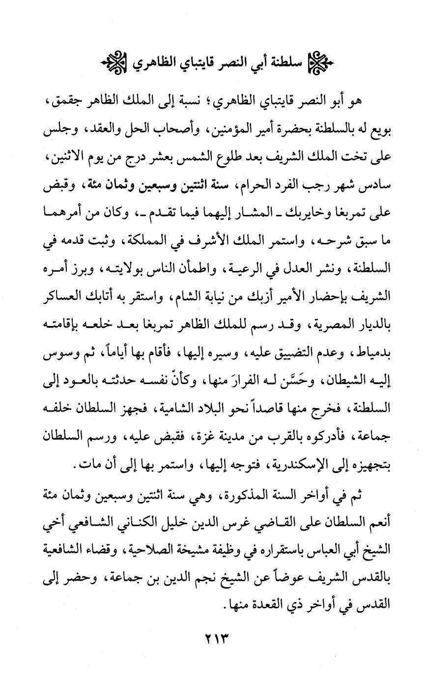 هو أبو النصر قايتباي الظاهري؛ نسبة إلى الملك الظاهر جقمق، بويع له بالسلطنة بحضرة أمير المؤمنين، وأصحاب الحل والعقد، وجلس على تخت الملك الشريف بعد طلوع الشمس بعشر درج من يوم الاثنين، سادس شهر رجب الفرد الحرام، سنة اثنتين وسبعين وثمان مئة، وقبض على تمربغا وخايربك - المشار إليهما فيما تقدم -، وكان من أمرهما ما سبق شرحه، واستمر الملك الأشرف في المملكة، وثبت قدمه في السلطنة، ونشر العدل في الرعية، واطمأن الناس بولايته، وبرز أمره الشريف بإحضار الأمير أزبك من نيابة الشام، واستقر به أتابك العساكر بالديار المصرية، وقد رسم للملك الظاهر تمربغا بعد خلعه بإقامته بدمياط، وعدم التضييق عليه، وسيره إليها، فأقام بها أياماً، ثم وسوس إليه الشيطان، وحَسَّن له الفرارَ منها، وكأنّ نفسه حدثته بالعود إلى السلطنة، فخرج منها قاصداً نحو البلاد الشامية، فجهز السلطان خلفه جماعة، فأدركوه بالقرب من مدينة غزة، فقبض عليه، ورسم السلطان بتجهيزه إلى الإسكندرية، فتوجه إليها، واستمر بها إلى أن مات.