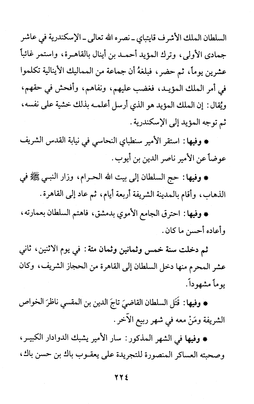 * وفيها: حج السلطان إلى بيت الله الحرام، وزار النبي - صلى الله عليه وسلم - في الذهاب، وأقام بالمدينة الشريفة أربعة أيام، ثم عاد إلى القاهرة.