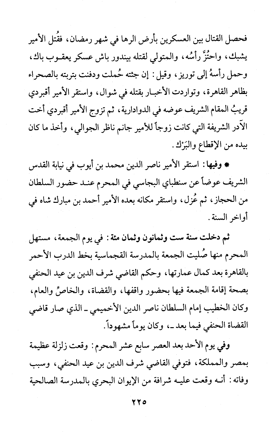 وفي يوم الأحد بعد العصر سابع عشر المحرم: وقعت زلزلة عظيمة بمصر والمملكة، فتوفي القاضي شرف الدين بن عيد الحنفي، وسبب وفاته: أنه وقعت عليه شرافة من الإيوان البحري بالمدرسة الصالحية