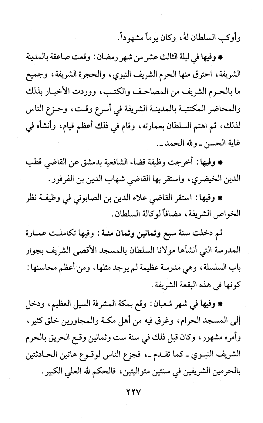 * وفيها في ليلة الثالث عشر من شهر رمضان: وقعت صاعقة بالمدينة الشريفة، احترق منها الحرم الشريف النبوي، والحجرة الشريفة، وجميع ما بالحرم الشريف من المصاحف والكتب، ووردت الأخبار بذلك والمحاضر المكتتبة بالمدينة الشريفة في أسرع وقت، وجزع الناس لذلك، ثم اهتم السلطان بعمارته، وقام في ذلك أعظم قيام، وأنشأه في غاية الحسن - ولله الحمد -.