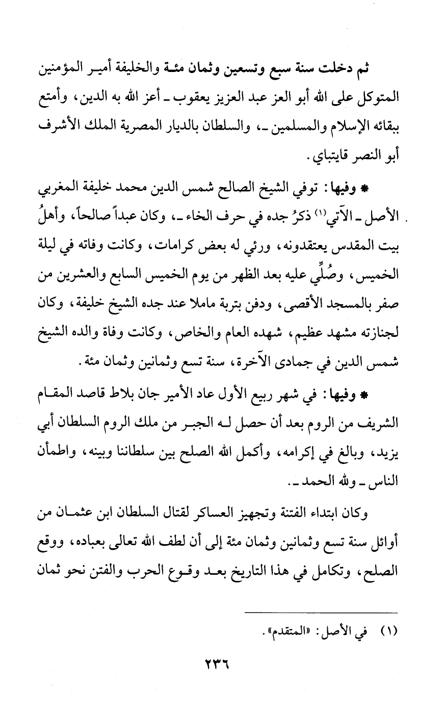 ثم دخلت سنة سبع وتسعين وثمان مئة والخليفة أمير المؤمنين المتوكل على الله أبو العز عبد العزيز يعقوب - أعز الله به الدين، وأمتع ببقائه الإسلام والمسلمين -، والسلطان بالديار المصرية الملك الأشرف أبو النصر قايتباي.