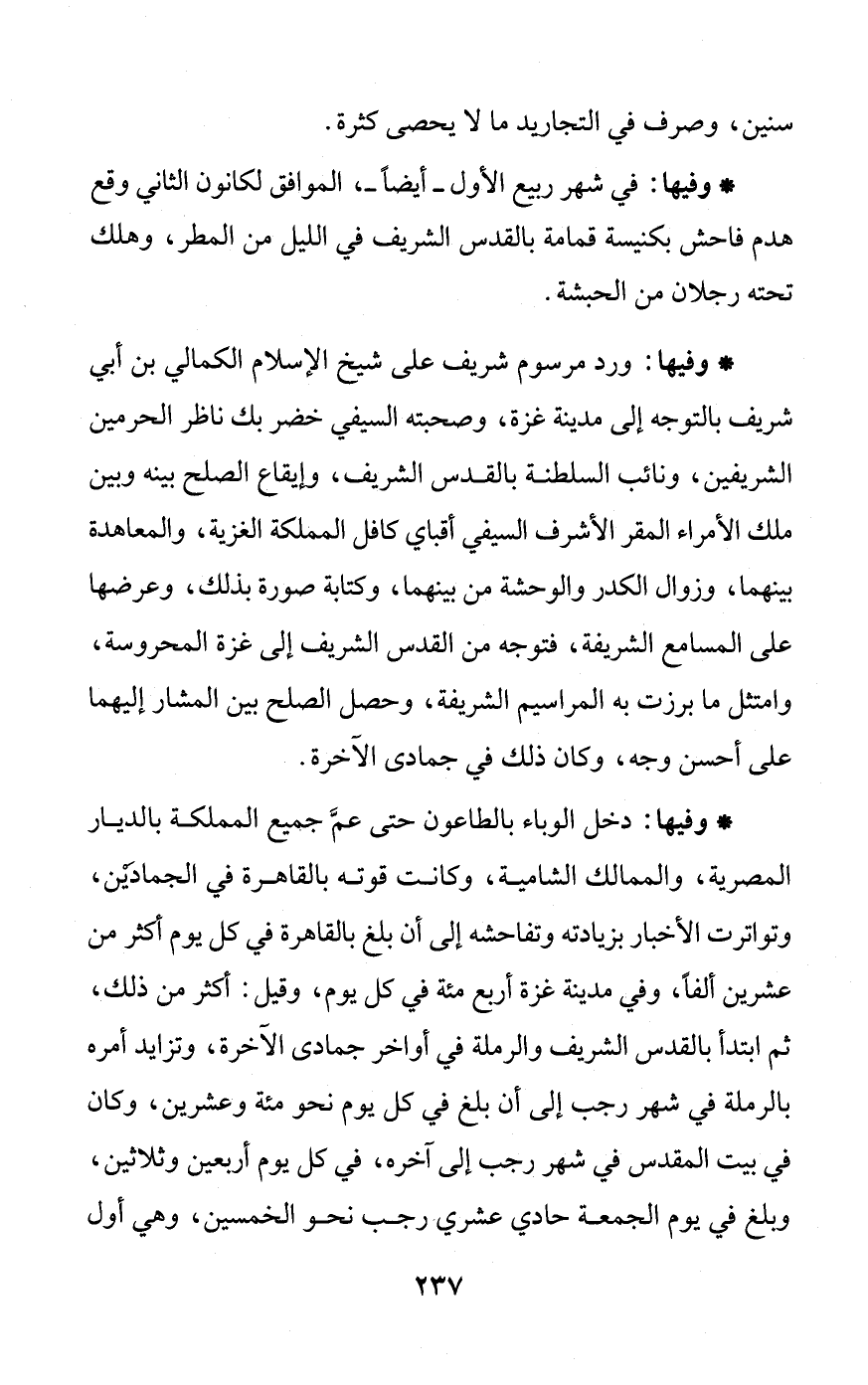 * وفيها: دخل الوباء بالطاعون حتى عمَّ جميع المملكة بالديار المصرية، والممالك الشامية، وكانت قوته بالقاهرة في الجمادَيْن، وتواترت الأخبار بزيادته وتفاحشه إلى أن بلغ بالقاهرة في كل يوم أكثر من عشرين ألفاً، وفي مدينة غزة أربع مئة في كل يوم، وقيل: أكثر من ذلك، ثم ابتدأ بالقدس الشريف والرملة في أواخر جمادى الآخرة، وتزايد أمره بالرملة في شهر رجب إلى أن بلغ في كل يوم نحو مئة وعشرين، وكان في بيت المقدس في شهر رجب إلى آخره، في كل يوم أربعين وثلاثين، وبلغ في يوم الجمعة حادي عشري رجب نحو الخمسين، وهي أول