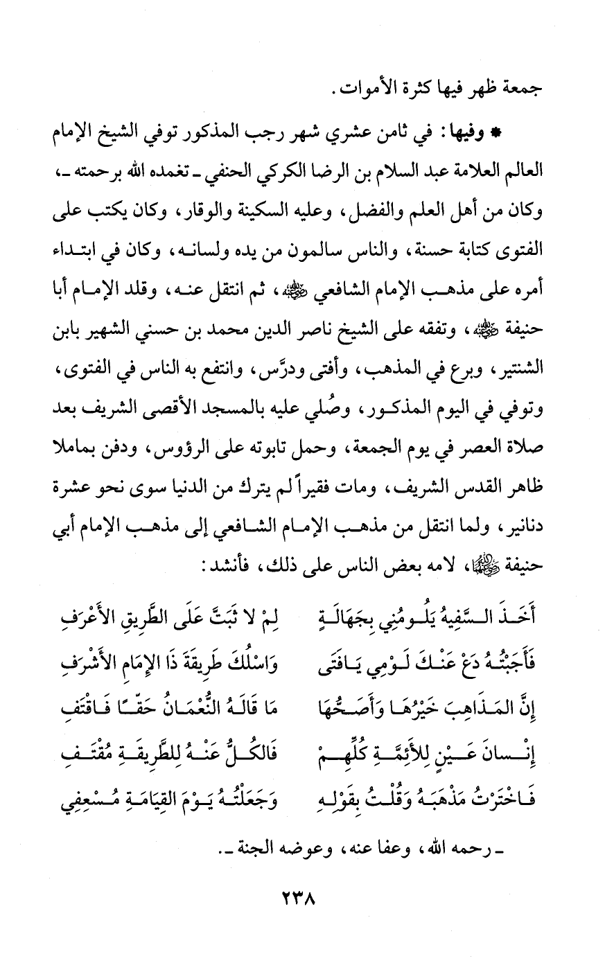 * وفيها: في ثامن عشري شهر رجب المذكور توفي الشيخ الإمام العالم العلامة عبد السلام بن الرضا الكركي الحنفي - تغمده الله برحمته -، وكان من أهل العلم والفضل، وعليه السكينة والوقار، وكان يكتب على الفتوى كتابة حسنة، والناس سالمون من يده ولسانه، وكان في ابتداء أمره على مذهب الإمام الشافعي - رضي الله عنه -، ثم انتقل عنه، وقلد الإمام أبا حنيفة - رضي الله عنه -، وتفقه على الشيخ ناصر الدين محمد بن حسني الشهير بابن الشنتير، وبرع في المذهب، وأفتى ودرَّس، وانتفع به الناس في الفتوى، وتوفي في اليوم المذكور، وصُلي عليه بالمسجد الأقصى الشريف بعد صلاة العصر في يوم الجمعة، وحمل تابوته على الرؤوس، ودفن بماملا ظاهر القدس الشريف، ومات فقيرًا لم يترك من الدنيا سوى نحو عشرة دنانير، ولما انتقل من مذهب الإمام الشافعي إلى مذهب الإمام أبي حنيفة - رضي الله عنهما -، لامه بعض الناس على ذلك، فأنشد: