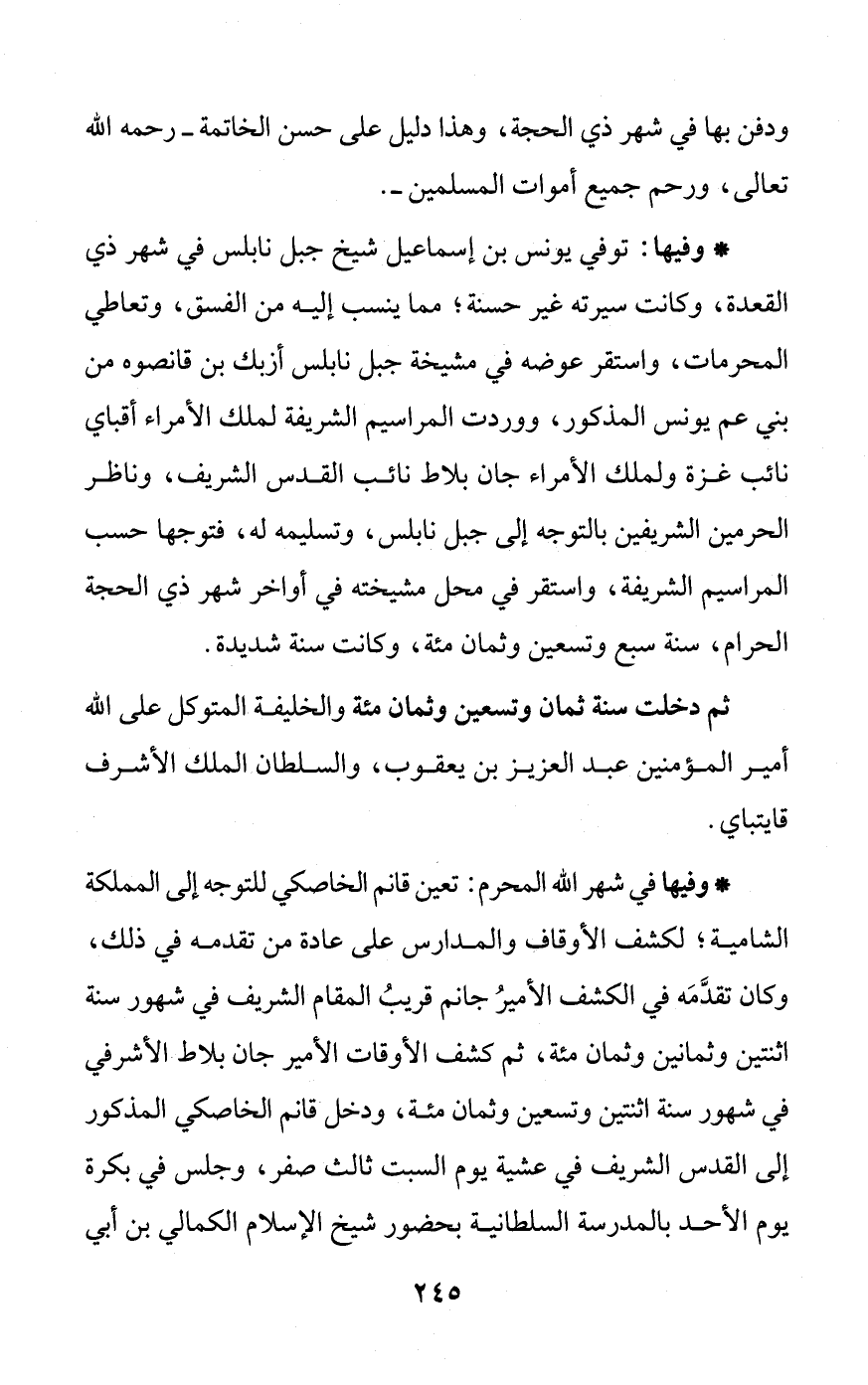 * وفيها: توفي يؤنس بن إسماعيل شيخ جبل نابلس في شهر ذي القعدة، وكانت سيرته غير حسنة؛ مما ينسب إليه من الفسق، وتعاطي المحرمات، واستقر عوضه في مشيخة جبل نابلس أزبك بن قانصوه من بني عم يونس المذكور، ووردت المراسيم الشريفة لملك الأمراء أقباي نائب غزة ولملك الأمراء جان بلاط نائب القدس الشريف، وناظر الحرمين الشريفين بالتوجه إلى جبل نابلس، وتسليمه له، فتوجها حسب المراسيم الشريفة، واستقر في محل مشيخته في أواخر شهر ذي الحجة الحرام، سنة سبع وتسعين وثمان مئة، وكانت سنة شديدة.