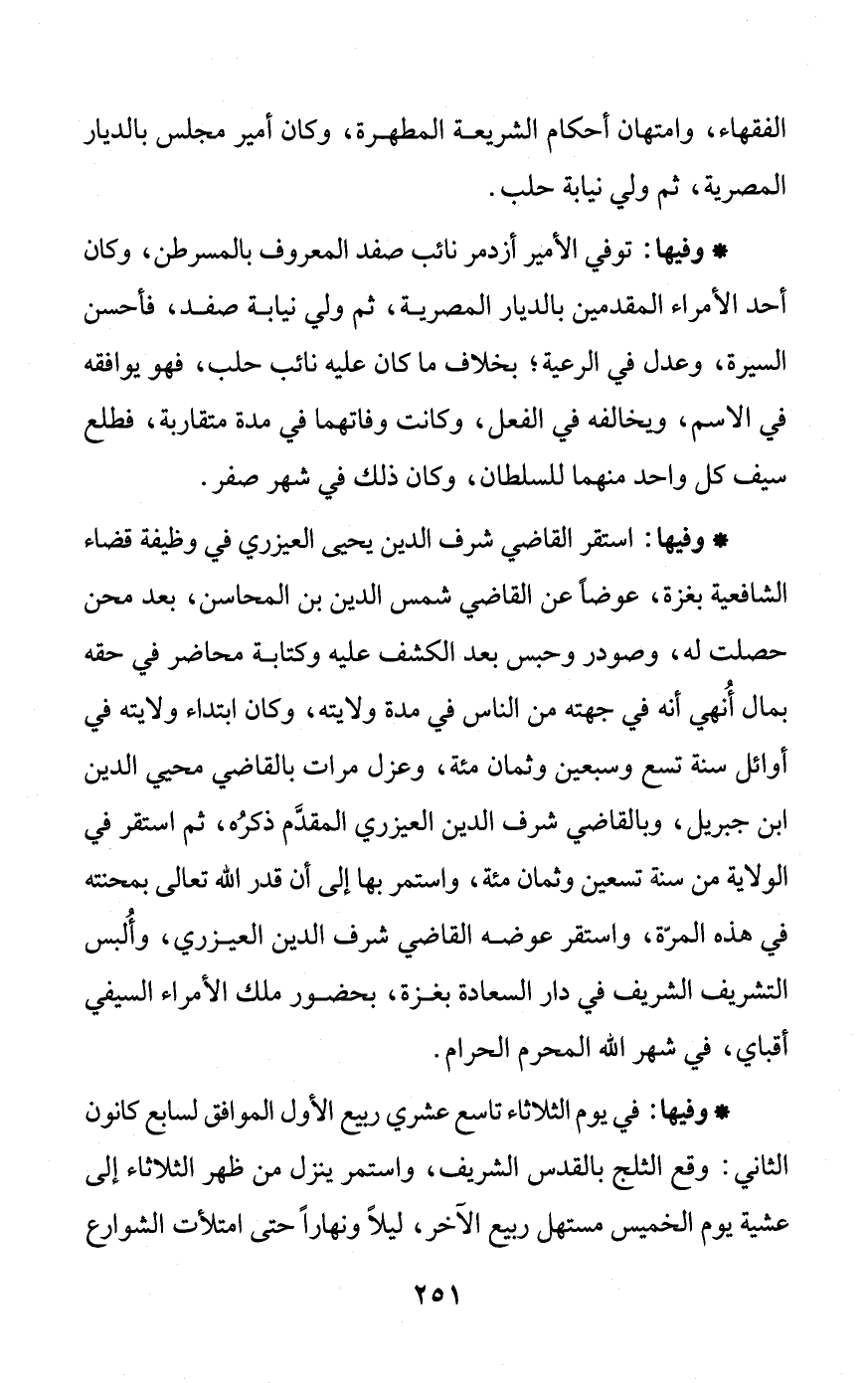 * وفيها: استقر القاضي شرف الدين يحيى العيزري في وظيفة قضاء الشافعية بغزة، عوضًا عن القاضي شمس الدين بن المحاسن، بعد محن حصلت له، وصودر وحبس بعد الكشف عليه وكتابة محاضر في حقه بمال أُنهي أنه في جهته من الناس في مدة ولايته، وكان ابتداء ولايته في أوائل سنة تسع وسبعين وثمان مئة، وعزل مرات بالقاضي محيي الدين ابن جبريل، وبالقاضي شرف الدين العيزري المقدَّم ذكرُه، ثم استقر في الولاية من سنة تسعين وثمان مئة، واستمر بها إلى أن قدر الله تعالى بمحنته في هذه المرّة، واستقر عوضه القاضي شرف الدين العيزري، وأُلبس التشريف الشريف في دار السعادة بغزة، بحضور ملك الأمراء السيفي أقباي، في شهر الله المحرم الحرام.