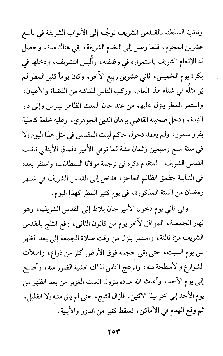 ونائبَ السلطنة بالقدس الشريف توجَّه إلى الأبواب الشريفة في تاسع عشرين المحرم، فلما وصل إلى الخدم الشريفة، بقي هناك مدة، وحصل له الإنعام الشريف باستمراره في وظيفته، وأُلبس التشريف، ودخلها في بكرة يوم الخميس، ثاني عشرين ربيع الآخر، وكان يومًا كثير المطر لم يُر مثلُه في شتاء هذا العام، وركب الناس للقائه من القضاة والأعيان، واستمر المطر ينزل عليهم من عند خان الملك الظاهر بيبرس وإلى دار النيابة، ودخل صحبته القاضي برهان الدين الجوهري، وعليه خلعة كاملية بفرو سمور، ولم يعهد دخول حاكم لبيت المقدس في مثل هذا اليوم إلا في سنة سبع وسبعين وثمان مئة لما توفي الأمير دقماق الأينالي نائب القدس الشريف - المتقدم ذكره في ترجمة مولانا السلطان -، واستقر بعده في النيابة جقمق الظالم العاجز، فدخل إلى القدس الشريف في شهر رمضان من السنة المذكورة، في يوم كثير المطر كهذا اليوم.