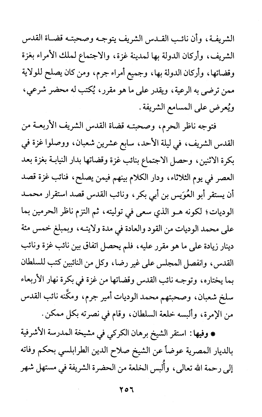 الشريفة، وأن نائب القدس الشريف يتوجه وصحبته قضاة القدس الشريف، وأركان الدولة بها لمدينة غزة، والاجتماع لملك الأمراء بغزة وقضاتها، وأركان الدولة بها، وجميع أمراء جرم، ومن كان يصلح للولاية ممن ترضى به الرعية، ويقدر على ما هو مقرر، يُكتب له محضر شرعي، وُيعرض على المسامع الشريفة.