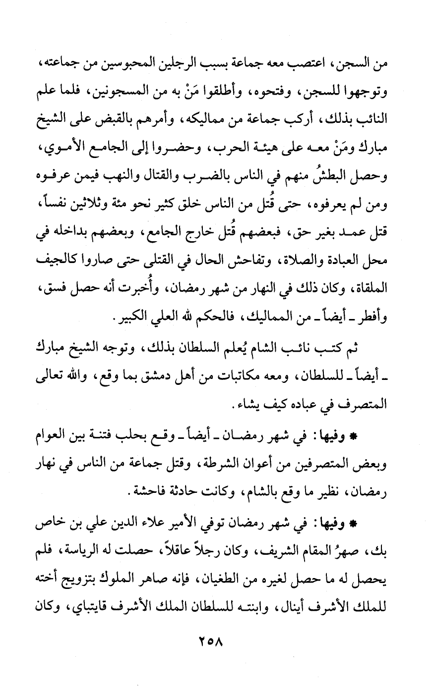 من السجن، اعتصب معه جماعة بسبب الرجلين المحبوسين من جماعته، وتوجهوا للسجن، وفتحوه، وأطلقوا مَنْ به من المسجونين، فلما علم النائب بذلك، أركب جماعة من مماليكه، وأمرهم بالقبض على الشيخ مبارك ومَنْ معه على هيئة الحرب، وحضروا إلى الجامع الأموي، وحصل البطشُ منهم في الناس بالضرب والقتال والنهب فيمن عرفوه ومن لم يعرفوه، حتى قُتل من الناس خلق كثير نحو مئة وثلاثين نفساً، قتل عمد بغير حق، فبعضهم قُتل خارج الجامع، وبعضهم بداخله في محل العبادة والصلاة، وتفاحش الحال في القتلى حتى صاروا كالجيف الملقاة، وكان ذلك في النهار من شهر رمضان، وأُخبرت أنه حصل فسق، وأفطر - أيضاً - من المماليك، فالحكم لله العلي الكبير.