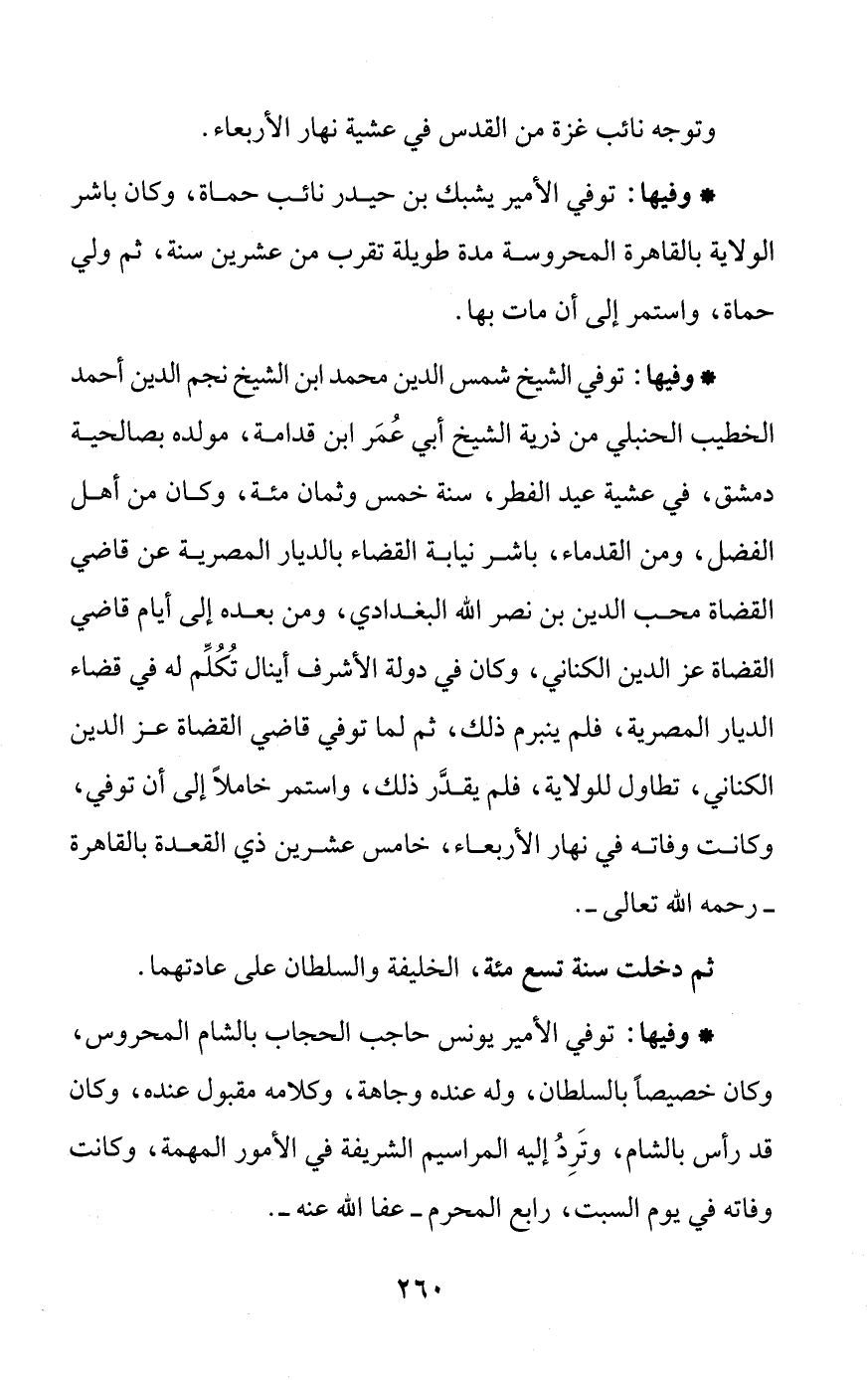* وفيها: توفي الأمير يونس حاجب الحجاب بالشام المحروس، وكان خصيصاً بالسلطان، وله عنده وجاهة، وكلامه مقبول عنده، وكان قد رأس بالشام، وتَرِدُ إليه المراسيم الشريفة في الأمور المهمة، وكانت وفاته في يوم السبت، رابع المحرم - عفا الله عنه -.