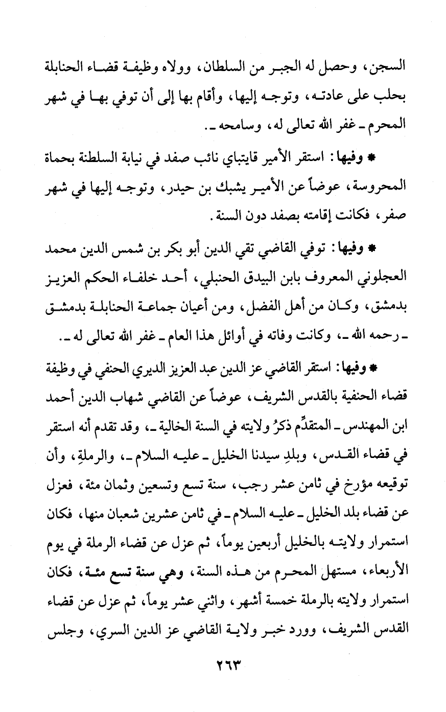 * وفيها: استقر القاضي عز الدين عبد العزيز الديري الحنفي في وظيفة قضاء الحنفية بالقدس الشريف، عوضاً عن القاضي شهاب الدين أحمد ابن المهندس - المتقدِّم ذكرُ ولايته في السنة الخالية -، وقد تقدم أنه استقر في قضاء القدس، وبلدِ سيدنا الخليل - عليه السلام -، والرملةِ، وأن توقيعه مؤرخ في ثامن عشر رجب، سنة تسع وتسعين وثمان مئة، فعزل عن قضاء بلد الخليل - عليه السلام - في ثامن عشرين شعبان منها، فكان استمرار ولايته بالخليل أربعين يومًا، ثم عزل عن قضاء الرملة في يوم الأربعاء، مستهل المحرم من هذه السنة، وهي سنة تسع مئة، فكان استمرار ولايته بالرملة خمسة أشهر، واثني عشر يومًا، ثم عزل عن قضاء القدس الشريف، وورد خبر ولاية القاضي عز الدين السري، وجلس