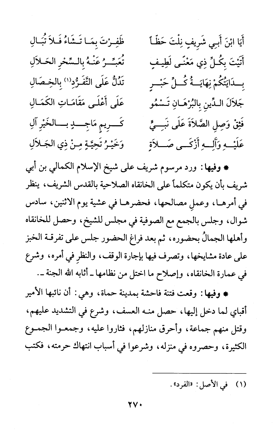 جَلاَلَ الدِّينِ بِالبُرْهَانِ تَسْمُو ... عَلَى أَعْلَى مَقَامَاتِ الكَمَالِ