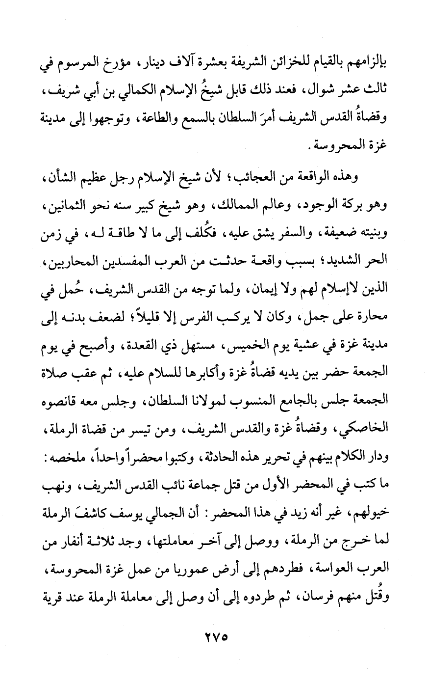 وهذه الواقعة من العجائب؛ لأن شيخ الإسلام رجل عظيم الشأن، وهو بركة الوجود، وعالم الممالك، وهو شيخ كبير سنه نحو الثمانين، وبنيته ضعيفة، والسفر يشق عليه، فكُلف إلى ما لا طاقة له، في زمن الحر الشديد؛ بسبب واقعة حدثت من العرب المفسدين المحاربين، الذين لا إسلام لهم ولا إيمان، ولما توجه من القدس الشريف، حُمل في محارة على جمل، وكان لا يركب الفرس إلا قليلاً؛ لضعف بدنه إلى مدينة غزة في عشية يوم الخميس، مستهل ذي القعدة، وأصبح في يوم الجمعة حضر بين يديه قضاةُ غزة وأكابرها للسلام عليه، ثم عقب صلاة الجمعة جلس بالجامع المنسوب لمولانا السلطان، وجلس معه قانصوه الخاصكي، وقضاةُ غزة والقدس الشريف، ومن تيسر من قضاة الرملة، ودار الكلام بينهم في تحرير هذه الحادثة، وكتبوا محضرًا واحداً، ملخصه: ما كتب في المحضر الأول من قتل جماعة نائب القدس الشريف، ونهب خيولهم، غير أنه زيد في هذا المحضر: أن الجمالي يوسف كاشفَ الرملة لما خرج من الرملة، ووصل إلى آخر معاملتها، وجد ثلاثة أنفار من العرب العواسة، فطردهم إلى أرض عموريا من عمل غزة المحروسة، وقُتل منهم فرسان، ثم طردوه إلى أن وصل إلى معاملة الرملة عند قرية