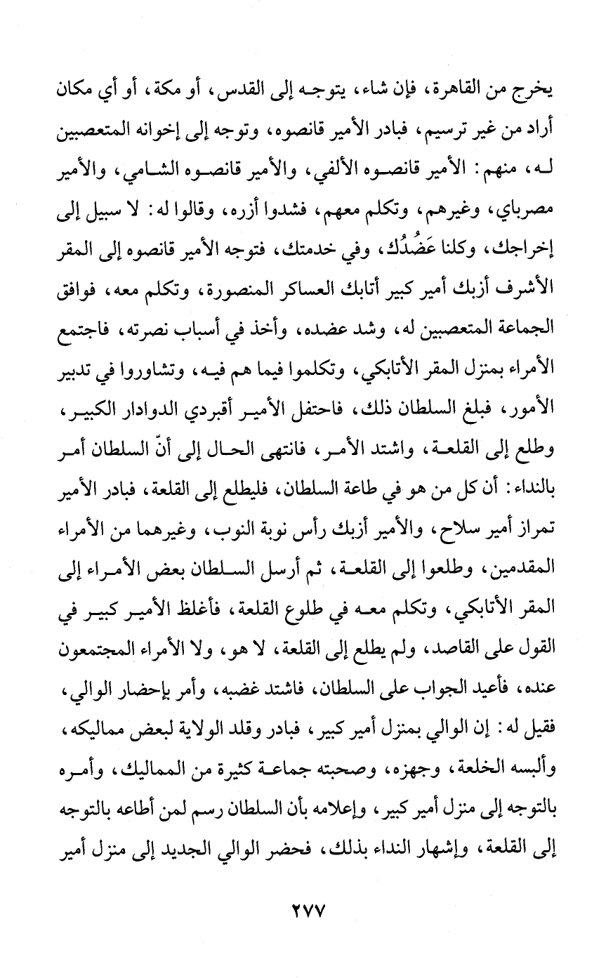 يخرج من القاهرة، فإن شاء، يتوجه إلى القدس، أو مكة، أو أي مكان أراد من غير ترسيم، فبادر الأمير قانصوه، وتوجه إلى إخوانه المتعصبين له، منهم: الأمير قانصوه الألفي، والأمير قانصوه الشامي، والأمير مصرباي، وغيرهم، وتكلم معهم، فشدوا أزره، وقالوا له: لا سبيل إلى إخراجك، وكلنا عَضُدُك، وفي خدمتك، فتوجه الأمير قانصوه إلى المقر الأشرف أزبك أمير كبير أتابك العساكر المنصورة، وتكلم معه، فوافق الجماعة المتعصبين له، وشد عضده، وأخذ في أسباب نصرته، فاجتمع الأمراء بمنزل المقر الأتابكي، وتكلموا فيما هم فيه، وتشاوروا في تدبير الأمور، فبلغ السلطان ذلك، فاحتفل الأمير أقبردي الدوادار الكبير، وطلع إلى القلعة، واشتد الأمر، فانتهى الحال إلى أنّ السلطان أمر بالنداء: أن كل من هو في طاعة السلطان، فليطلع إلى القلعة، فبادر الأمير تمراز أمير سلاح، والأمير أزبك رأس نوبة النوب، وغيرهما من الأمراء المقدمين، وطلعوا إلى القلعة، ثم أرسل السلطان بعض الأمراء إلى المقر الأتابكي، وتكلم معه في طلوع القلعة، فأغلظ الأمير كبير في القول على القاصد، ولم يطلع إلى القلعة، لا هو، ولا الأمراء المجتمعون عنده، فأعيد الجواب على السلطان، فاشتد غضبه، وأمر بإحضار الوالي، فقيل له: إن الوالي بمنزل أمير كبير، فبادر وقلد الولاية لبعض مماليكه، وألبسه الخلعة، وجهزه، وصحبته جماعة كثيرة من المماليك، وأمره بالتوجه إلى منزل أمير كبير، وإعلامه بأن السلطان رسم لمن أطاعه بالتوجه إلى القلعة، وإشهار النداء بذلك، فحضر الوالي الجديد إلى منزل أمير