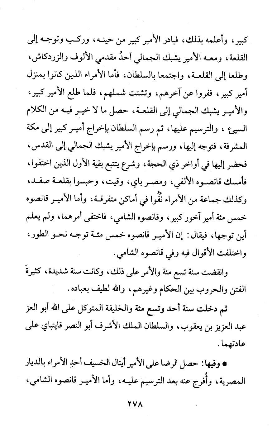 كبير، وأعلمه بذلك، فبادر الأمير كبير من حينه، وركب وتوجه إلى القلعة، ومعه الأمير يشبك الجمالي أحدُ مقدمي الألوف والزردكاش، وطلعا إلى القلعة، واجتمعا بالسلطان، فأما الأمراء الذين كانوا بمنزل أمير كبير، ففروا عن آخرهم، وتشتت شملهم، فلما طلع الأمير كبير، والأمير يشبك الجمالي إلى القلعة، حصل ما لا خير فيه من الكلام السئ، والترسيم عليها، ثم رسم السلطان بإخراج أمير كبير إلى مكة المشرفة، فتوجه إليها، ورسم بإخراج الأمير يشبك الجمالي إلى القدس، فحضر إليها في أواخر ذي الحجة، وشرع يتتبع بقية الأول الذين اختفوا، فأمسك قانصوه الألفي، ومصر باي، وقيت، وحبسوا بقلعة صفد، وكذلك جماعة من الأمراء نُفُوا في أماكن متفرقة، وأما الأمير قانصوه خمس مئة أمير آخور كبير، وقانصوه الشامي، فاختفى أمرهما، ولم يعلم أين توجها، فيقال: إن الأمير قانصوه خمس مئة توجه نحو الطور، واختلفت الأقوال فيه وفي قانصوه الشامي.