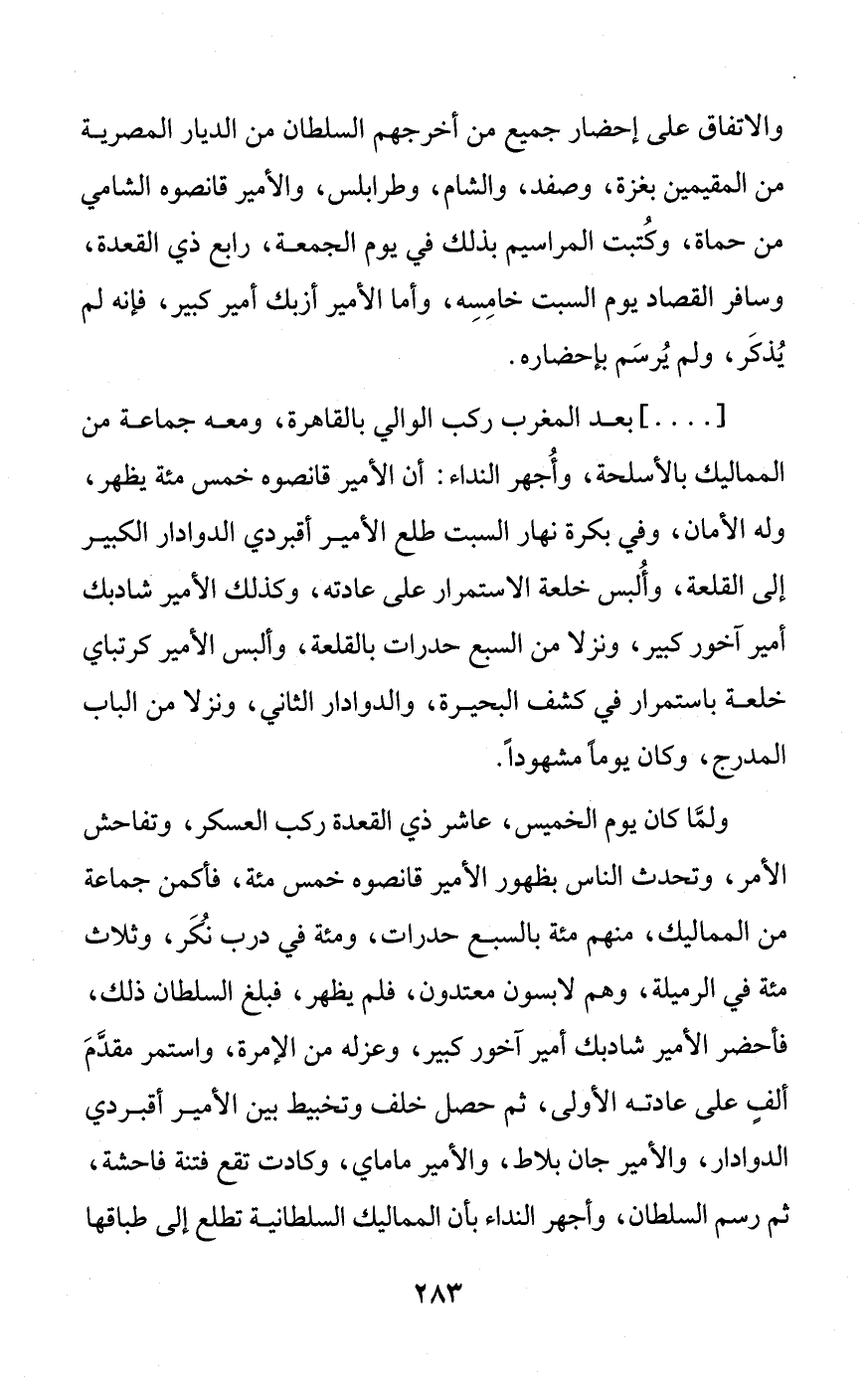 [ ... ] بعد المغرب ركب الوالي بالقاهرة، ومعه جماعة من المماليك بالأسلحة، وأُجهر النداء: أن الأمير قانصوه خمس مئة يظهر، وله الأمان، وفي بكرة نهار السبت طلع الأمير أقبردي الدوادار الكبير إلى القلعة، وأُلبس خلعة الاستمرار على عادته، وكذلك الأمير شادبك أمير آخور كبير، ونزلا من السبع حدرات بالقلعة، وألبس الأمير كرتباي خلعة باستمرار في كشف البحيرة، والدوادار الثاني، ونزلا من الباب المدرج، وكان يومًا مشهوداً.