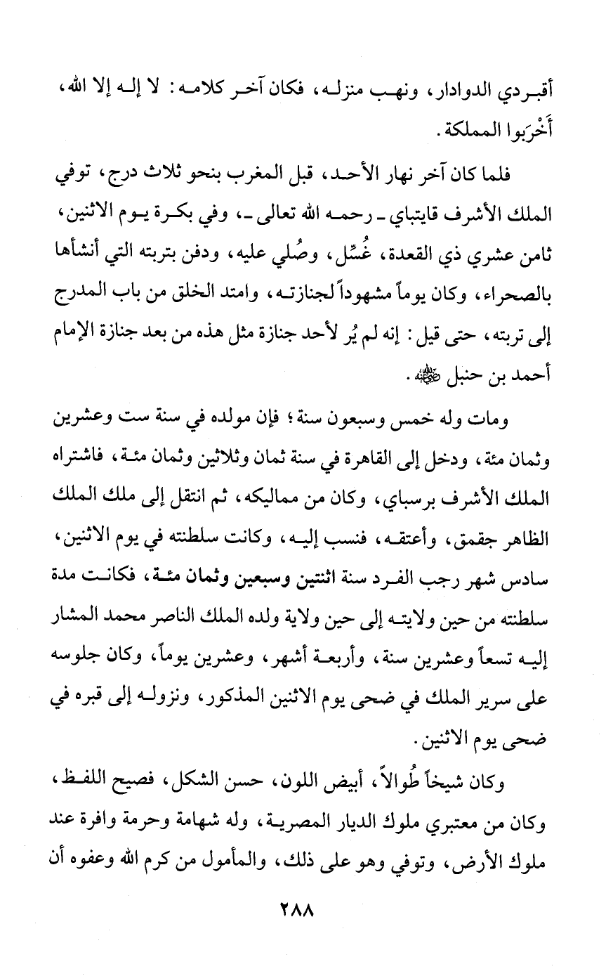 فلما كان آخر نهار الأحد، قبل المغرب بنحو ثلاث درج، توفي الملك الأشرف قايتباي - رحمه الله تعالى -، وفي بكرة يوم الاثنين، ثامن عشري ذي القعدة، غُسِّل، وصُلي عليه، ودفن بتربته التي أنشأها بالصحراء، وكان يوماً مشهوداً لجنازته، وامتد الخلق من باب المدرج إلى تربته، حتى قيل: إنه لم يُر لأحد جنازة مثل هذه من بعد جنازة الإمام أحمد بن حنبل - رضي الله عنه -.