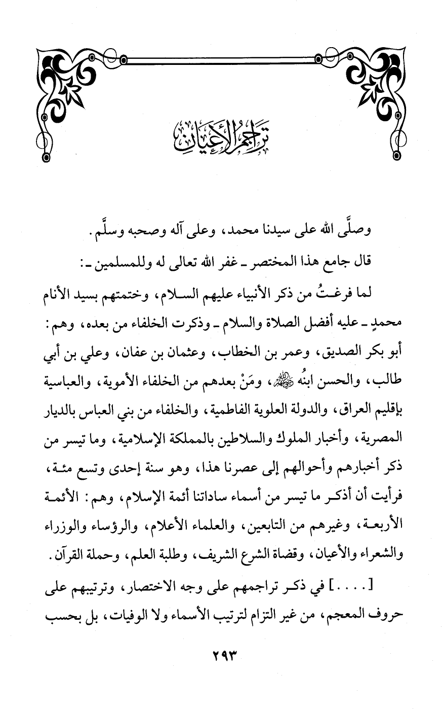 [ ... ] في ذكر تراجمهم على وجه الاختصار، وترتيبهم على حروف المعجم، من غير التزام لترتيب الأسماء ولا الوفيات، بل بحسب