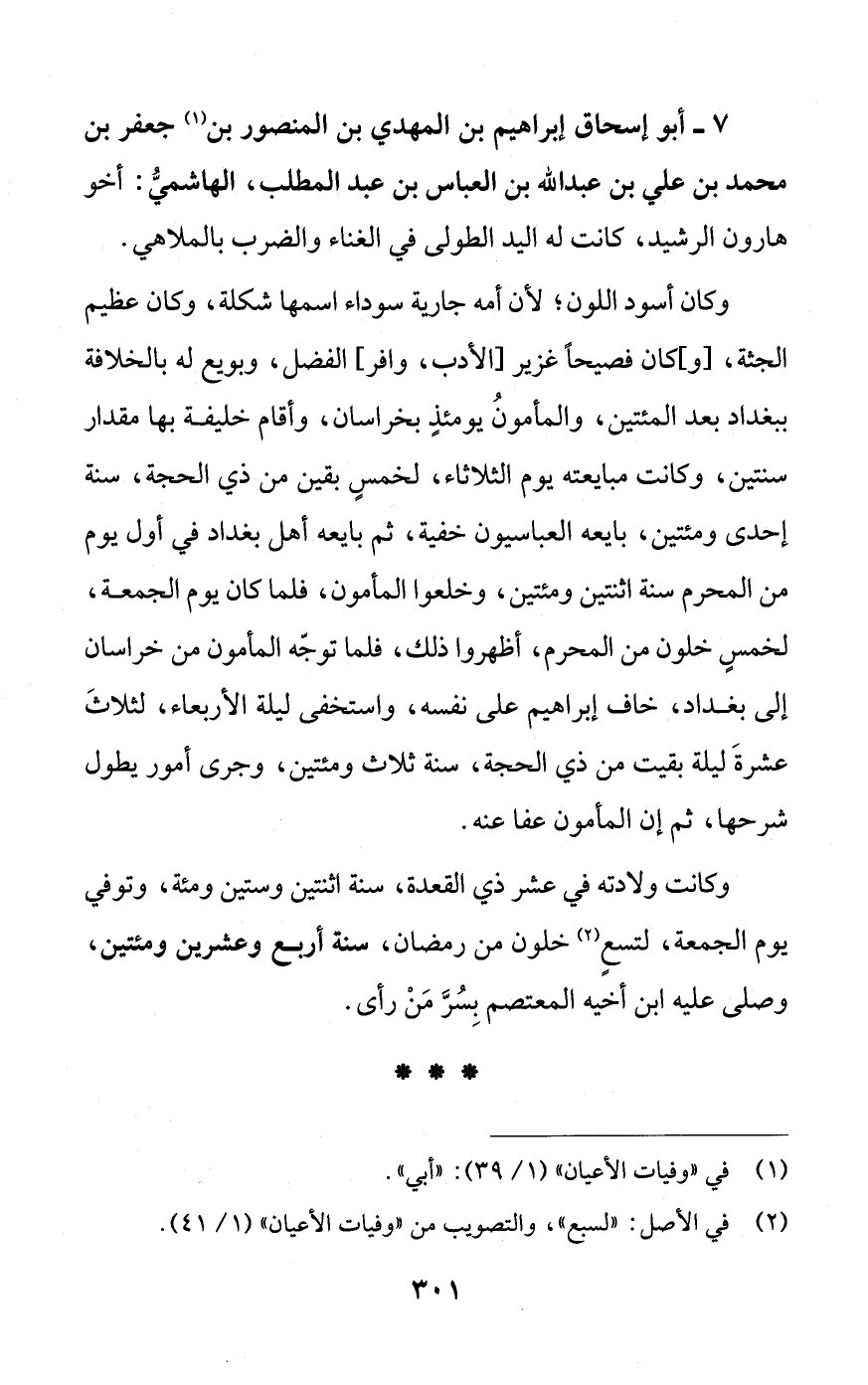 7 - أبو إسحاق إبراهيم بن المهدي بن المنصور بن (¬1) جعفر بن محمد بن علي بن عبد الله بن العباس بن عبد المطلب، الهاشميُّ: أخو هارون الرشيد، كانت له اليد الطولى في الغناء والضرب بالملاهي.