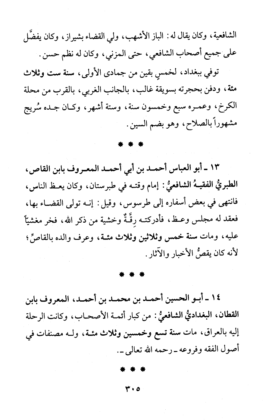 13 - أبو العباس أحمد بن أبي أحمد المعروف بابن القاص، الطبريُّ الفقيهُ الشافعيُّ: إمام وقته في طبرستان، وكان يعظ الناس، فانتهى في بعض أسفاره إلى طرسوس، وقيل: إنه تولى القضاء بها، فعقد له مجلس وعظ، فأدركته رِقَّةٌ وخشية من ذكر الله، فخر مغشيًّا عليه، ومات سنة خمس وثلاثين وثلاث مئة، وعرف والده بالقاصِّ؛ لأنه كان يقصُّ الأخبار والآثار.