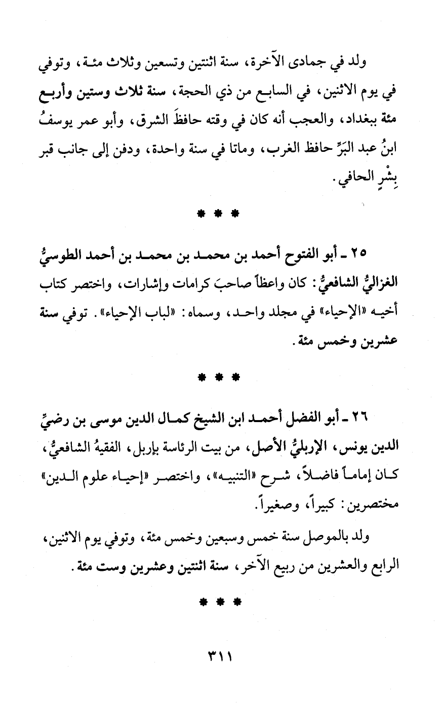 25 - أبو الفتوح أحمد بن محمَّد بن محمَّد بن أحمد الطوسيُّ الغزاليُّ الشافعيُّ: كان واعظاً صاحبَ كرامات وإشارات، واختصر كتاب أخيه "الإحياء" في مجلد واحد، وسماه: "لباب الإحياء".