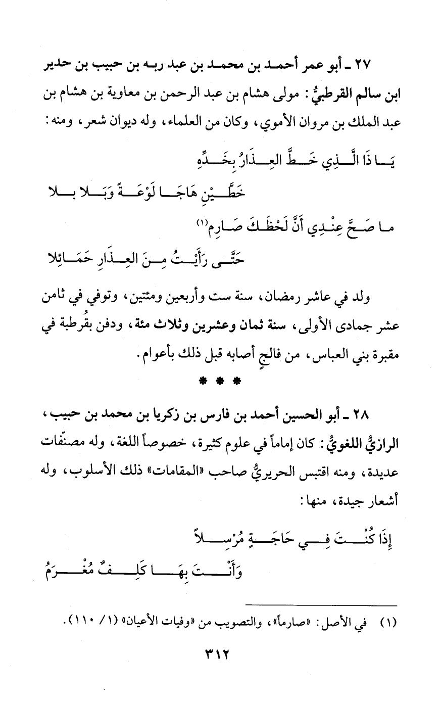 27 - أبو عمر أحمد بن محمَّد بن عبد ربه بن حبيب بن حدير ابن سالم القرطبيُّ: مولى هشام بن عبد الرحمن بن معاوية بن هشام بن عبد الملك بن مروان الأموي، وكان من العلماء، وله ديوان شعر، ومنه: