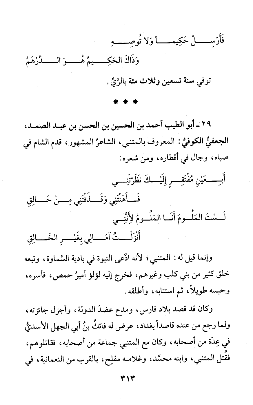 29 - أبو الطيب أحمد بن الحسين بن الحسن بن عبد الصمد، الجعفيُّ الكوفيُّ: المعروف بالمتنبي، الشاعرُ المشهور، قدم الشام في صباه، وجال في أقطاره، ومن شعره: