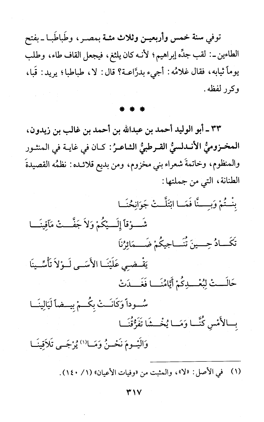33 - أبو الوليد أحمد بن عبد الله بن أحمد بن غالب بن زيدون، المخزوميُّ الأندلسيُّ القرطبيُّ الشاعرُ: كان في غاية في المنثور والمنظوم، وخاتمةَ شعراء بني مخزوم، ومن بديع قلائده: نظمُه القصيدةَ الطنانة، التي من جملتها: