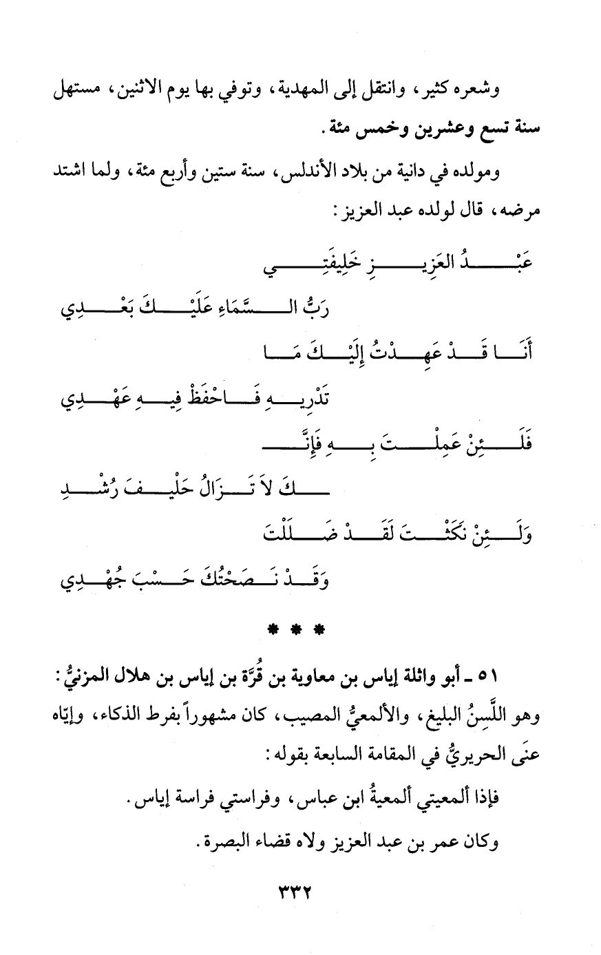 51 - أبو واثلة إياس بن معاوية بن قُرَّة بن إياس بن هلال المزنيُّ: وهو اللَّسِنُ البليغ، والألمعيُّ المصيب، كان مشهوراً بفرط الذكاء، وإيّاه عنَى الحريريُّ في المقامة السابعة بقوله: