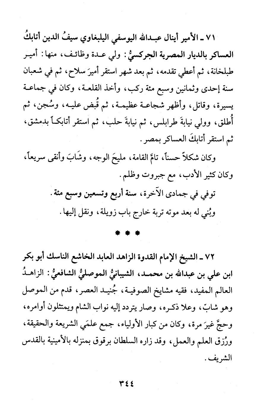 71 - الأمير أينال عبد الله اليوسفي اليلبغاوي سيف الدين أتابكُ العساكر بالديار المصرية الجركسيُّ: ولي عدة وظائف، منها: أمير طبلخانة، ثم أعطي تقدمه، ثم بعد شهر استقر أميرَ سلاح، ثم في شعبان سنة إحدى وثمانين وسبع مئة ركب، وأخذ القلعة، وكان في جماعة يسيرة، وقاتل، وأظهر شجاعة عظيمة، ثم قُبض عليه، وسُجن، ثم أُطلق، وولي نيابةَ طرابلس، ثم نيابةَ حلب، ثم استقر أتابكاً بدمشق، ثم استقر أتابكَ العساكر بمصر.