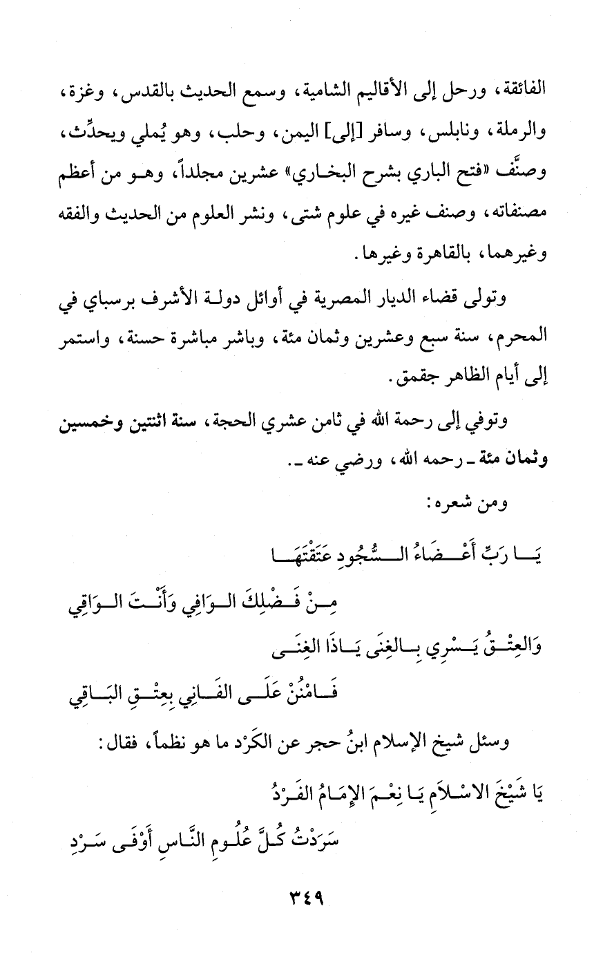 الفائقة، ورحل إلى الأقاليم الشامية، وسمع الحديث بالقدس، وغزة، والرملة، ونابلس، وسافر [إلى] اليمن، وحلب، وهو يُملي ويحدِّث، وصنَّف "فتح الباري بشرح البخاري" عشرين مجلداً، وهو من أعظم مصنفاته، وصنف غيره في علوم شتى، ونشر العلوم من الحديث والفقه وغيرهما، بالقاهرة وغيرها.