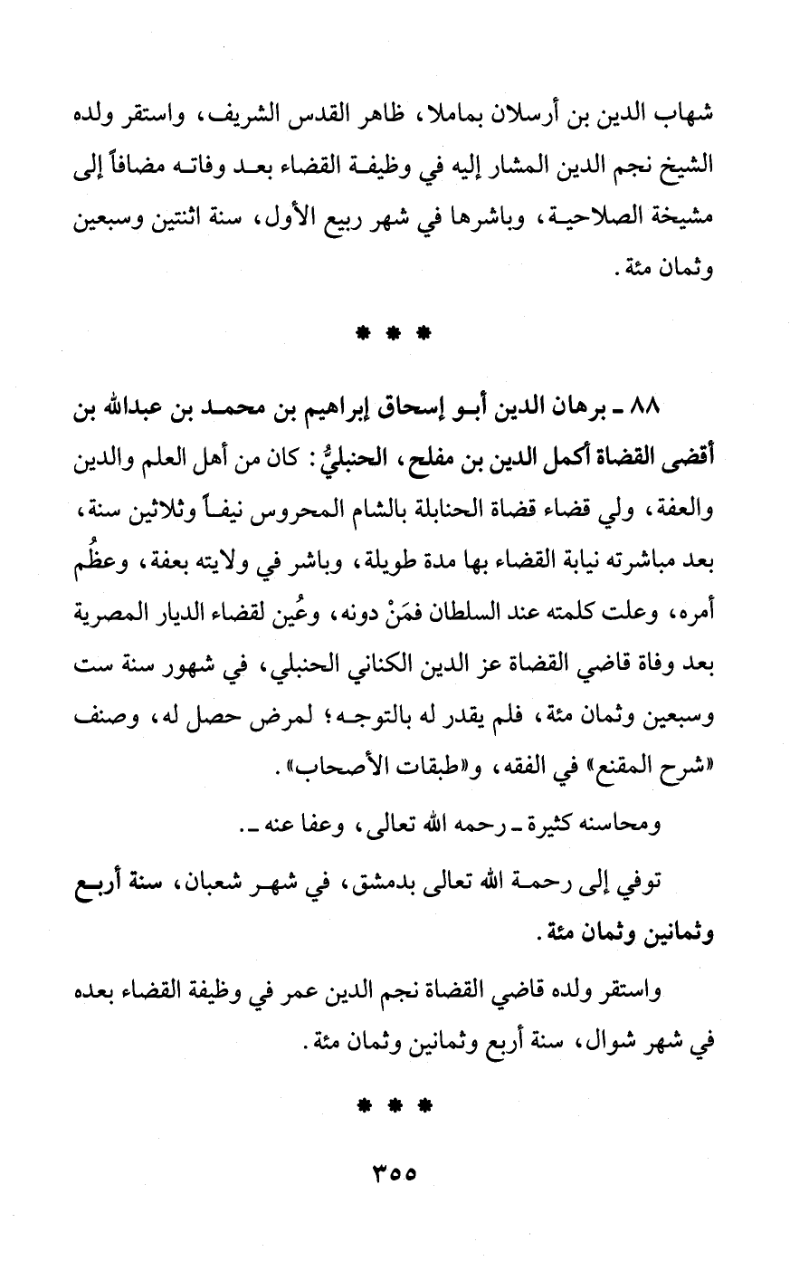 88 - برهان الدين أبو إسحاق إبراهيم بن محمَّد بن عبد الله بن أقضى القضاة أكمل الدين بن مفلح، الحنبليُّ: كان من أهل العلم والدين والعفة، ولي قضاء قضاة الحنابلة بالشام المحروس نيفًا وثلاثين سنة، بعد مباشرته نيابة القضاء بها مدة طويلة، وباشر في ولايته بعلة، وعظُم أمره، وعلت كلمته عند السلطان فمَنْ دونه، وعُين لقضاء الديار المصرية بعد وفاة قاضي القضاة عز الدين الكناني الحنبلي، في شهور سنة ست وسبعين وثمان مئة، فلم يقدر له بالتوجه؛ لمرض حصل له، وصنف "شرح المقنع" في الفقه، و"طبقات الأصحاب".