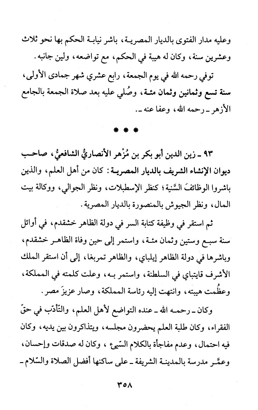 93 - زين الدين أبو بكر بن مُزْهر الأنصاريُّ الشافعيُّ، صاحب ديوان الإنشاء الشريف بالديار المصرية: كان من أهل العلم، والذين باشروا الوظائفَ السَّنية؛ كنظر الإسطبلات، ونظر الجوالي، ووكالة بيت المال، ونظر الجيوش بالمنصورة بالديار المصرية.
