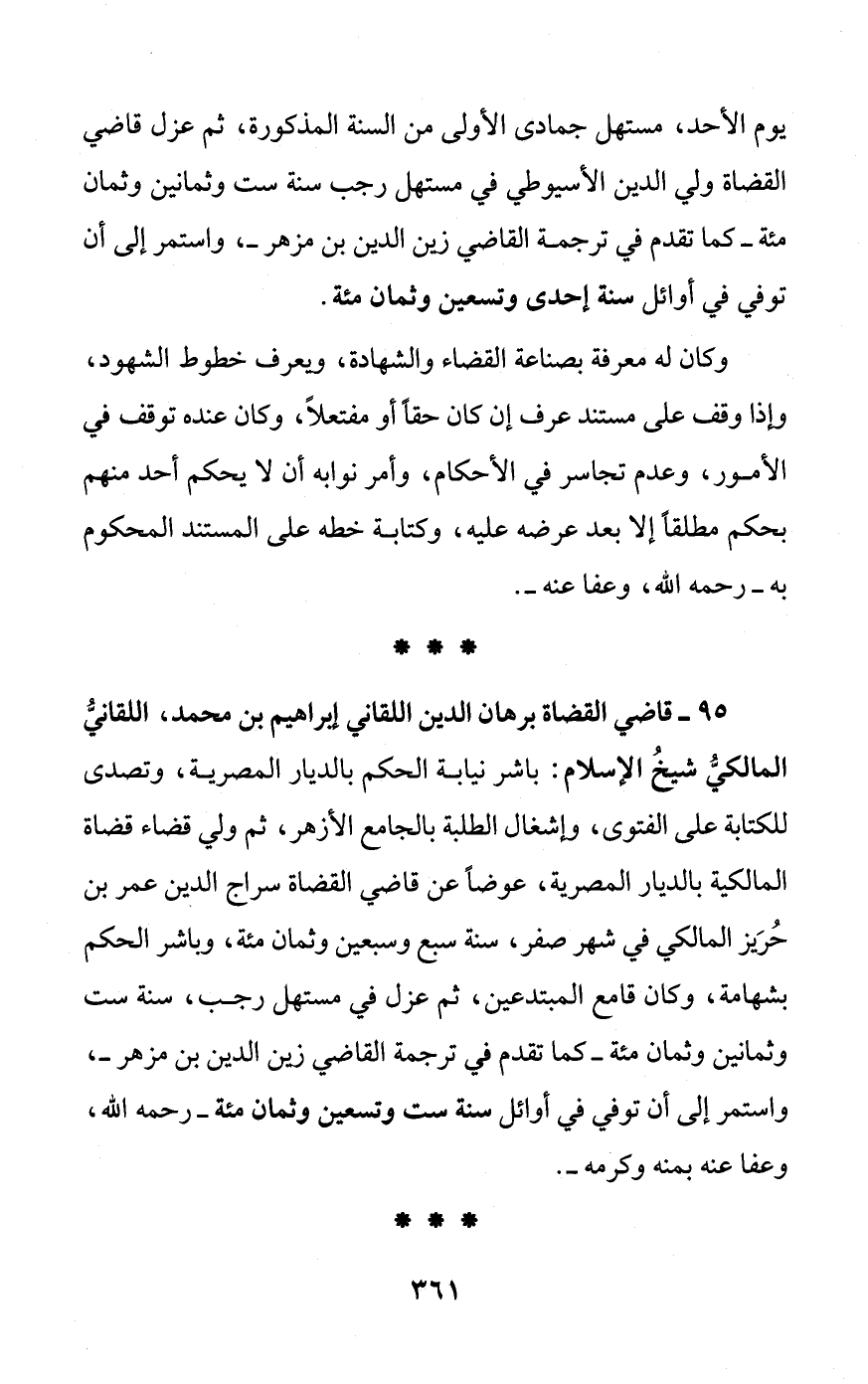 95 - قاضي القضاة برهان الدين اللقاني الراهيم بن محمد، اللقانيُّ المالكيُّ شيخُ الإسلام: باشر نيابة الحكم بالديار المصرية، وتصدى للكتابة على الفتوى، وإشغال الطلبة بالجامع الأزهر، ثم ولي قضاء قضاة المالكية بالديار المصرية، عوضًا عن قاضي القضاة سراج الدين عمر بن حُرَيز المالكي في شهر صفر، سنة سبع وسبعين وثمان مئة، وباشر الحكم بشهامة، وكان قامع المبتدعين، ثم عزل في مستهل رجب، سنة ست وثمانين وثمان مئة - كما تقدم في ترجمة القاضي زين الدين بن مزهر -، واستمر إلى أن توفي في أوائل سنة ست وتسعين وثمان مئة - رحمه الله، وعفا عنه بمنه وكرمه -.
