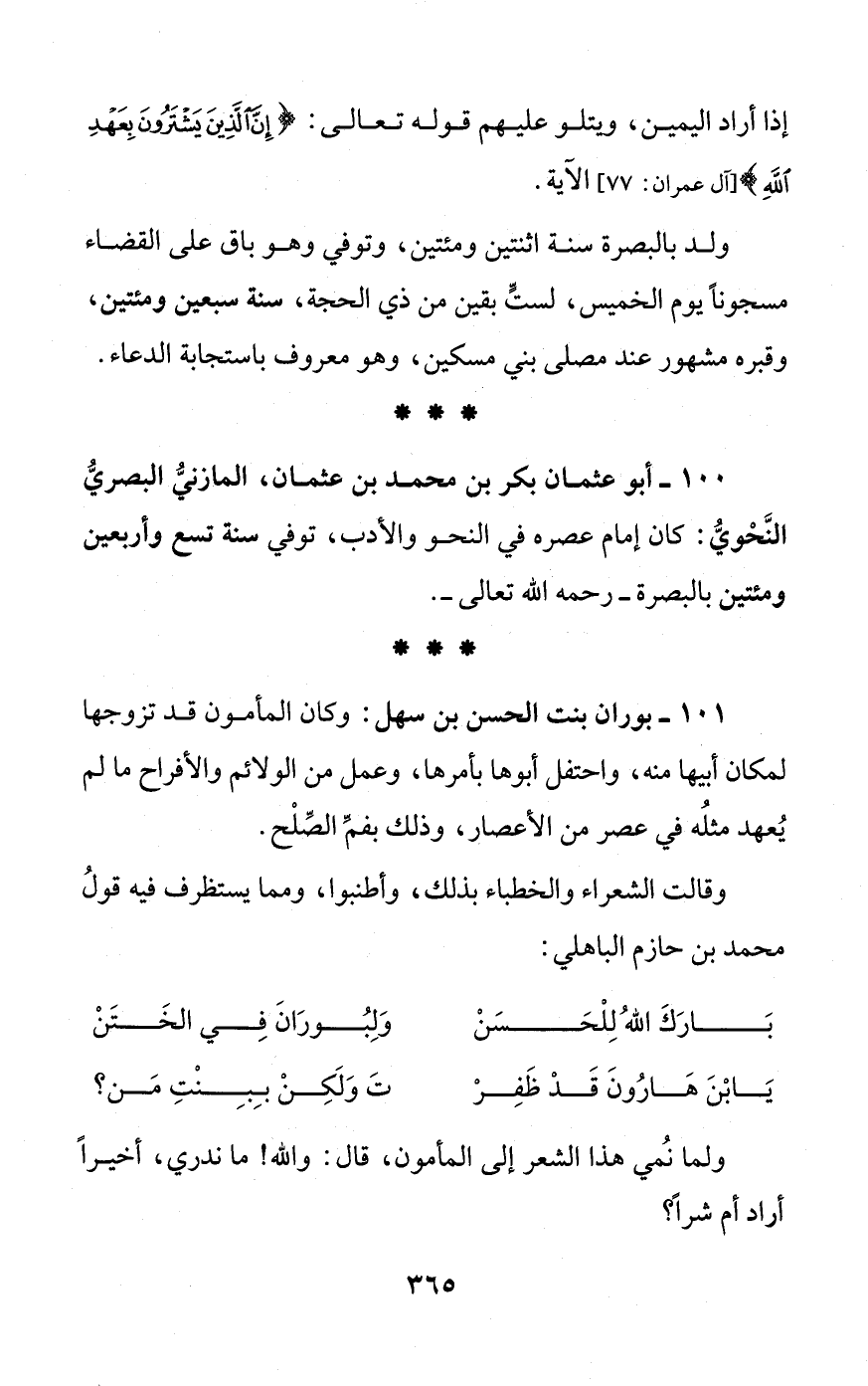100 - أبو عثمان بكر بن محمد بن عثمان، المارنيُّ البصريُّ النَّحْويُّ: كان إمام عصره في النحو والأدب، توفي سنة تسع وأربعين ومئتين بالبصرة - رحمه الله تعالى -.