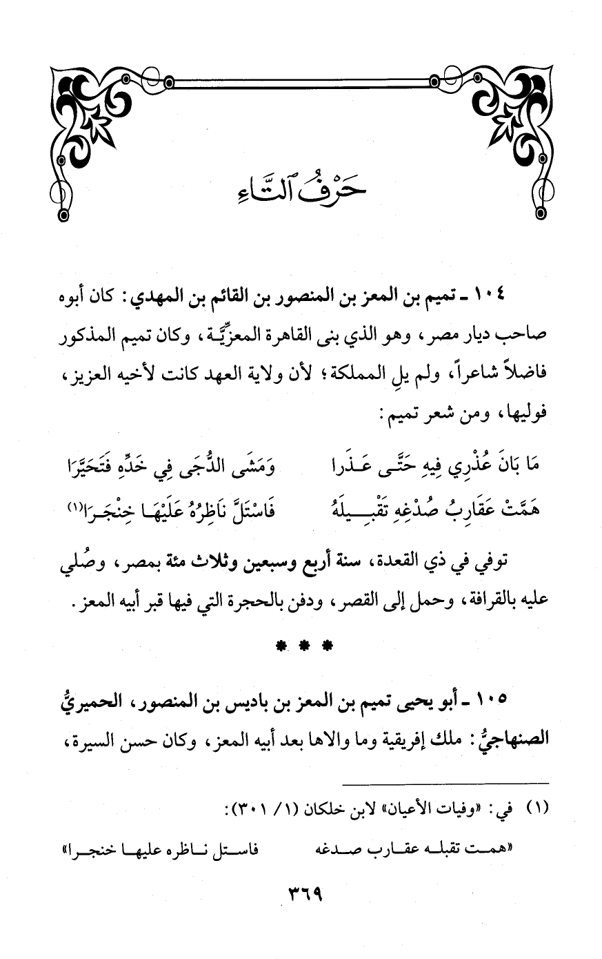 104 - تميم بن المعز بن المنصور بن القائم بن المهدي: كان أبوه صاحب ديار مصر، وهو الذي بنى القاهرة المعزِّيَّة، وكان تميم المذكور فاضلًا شاعرًا، ولم يلِ المملكة؛ لأن ولاية العهد كانت لأخيه العزيز، فوليها، ومن شعر تميم: