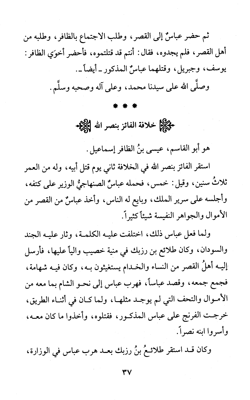 ولما فعل عباس ذلك، اختلفت عليه الكلمة، وثار عليه الجند والسودان، وكان طلائع بن رزبك في منية خصيب والياً عليها، فأرسل إليه أهلُ القصر من النساء والخدام يستغيثون به، وكان فيه شهامة، فجمع جمعه، وقصد عباساً، فهرب عباس إلى نحو الشام بما معه من الأموال والتحف التي لم يوجد مثلها، ولما كان في أثناء الطريق، خرجت الفرنج على عباس المذكور، فقتلوه، وأخذوا ما كان معه، وأسروا ابنه نصراً.