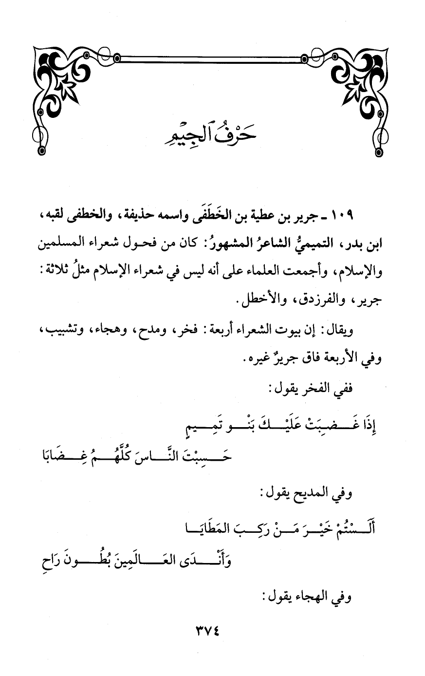 109 - جرير بن عطية بن الخَطَفَى واسمه حذيفة، والخطفى لقبه، ابن بدر، التميميُّ الشاعرُ المشهورُ: كان من فحول شعراء المسلمين والإسلام، وأجمعت العلماء على أنه ليس في شعراء الإسلام مثلُ ثلاثة: جرير، والفرزدق، والأخطل.