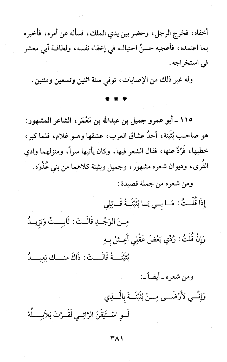 115 - أبو عمرو جميل بن عبد الله بن مَعْمَر، الشاعر المشهور: هو صاحب بُثَينة، أحدُ عشاق العرب، عشقها وهو غلام، فلما كبر، خطبها، فَرُدَّ عنها، فقال الشعر فيها، وكان يأتيها سرًا، ومنزلهما وادي القُرى، وديوان شعره مشهور، وجميل وبثينة كلاهما من بني عُذْرَة.