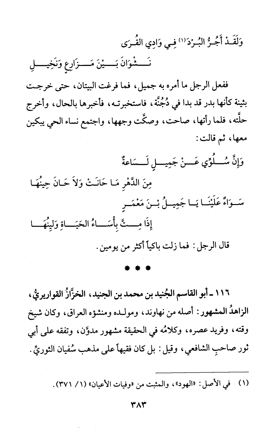 116 - أبو القاسم الجُنيد بن محمد بن الجنيد، الخزَّازُ القواريريُّ، الزاهدُ المشهور: أصله من نهاوند، ومولده ومنشؤه العراق، وكان شيخ وقته، وفريد عصره، وكلامُه في الحقيقة مشهور مدوَّن، وتفقه على أبي ثور صاحبِ الشافعي، وقيل: بل كان فقيها على مذهب سُفيان الثوريِّ.