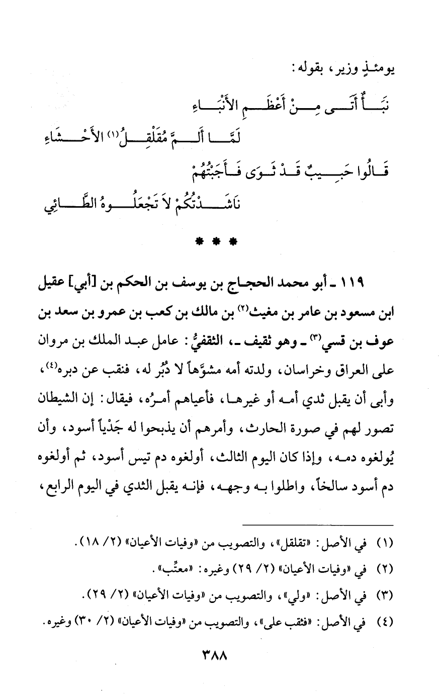 119 - أبو محمد الحجاج بن يوسف بن الحكم بن [أبي] عقيل ابن مسعود بن عامر بن مغيث (¬2) بن مالك بن كعب بن عمرو بن سعد بن عوف بن قسي (¬3) - وهو ثقيف -، الثقفيُّ: عامل عبد الملك بن مروان على العراق وخراسان، ولدته أمه مشوَّهًا لا دُبُر له، فنقب عن دبره (¬4)، وأبى أن يقبل ثدي أمه أو غيرها، فاعياهم أمرُه، فيقال: إن الشيطان تصور لهم في صورة الحارث، وأمرهم أن يذبحوا له جَدْيًا أسود، وأن يُولغوه دمه، وإذا كان اليوم الثالث، أولغوه دم تيس أسود، ثم أولغوه دم أسود سالخًا، واطلوا به وجهه، فإنه يقبل الثدي في اليوم الرابع،