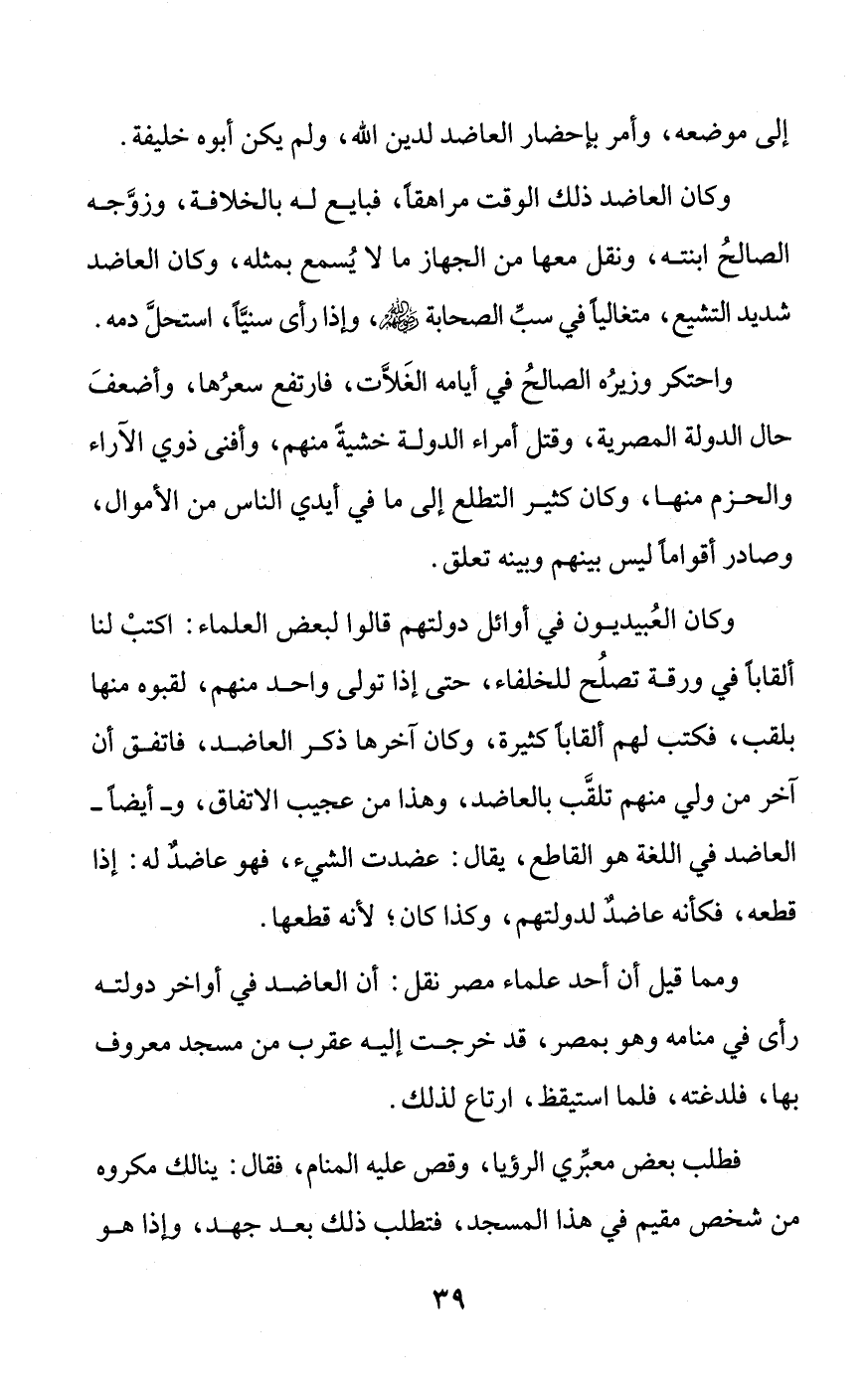 وكان العُبيديون في أوائل دولتهم قالوا لبعض العلماء: اكتبْ لنا ألقاباً في ورقة تصلُح للخلفاء، حتى إذا تولى واحد منهم، لقبوه منها بلقب، فكتب لهم ألقاباً كثيرة، وكان آخرها ذكر العاضد، فاتفق أن آخر من ولي منهم تلقَّب بالعاضد، وهذا من عجيب الاتفاق، و - أيضاً - العاضد في اللغة هو القاطع، يقال: عضدت الشيء، فهو عاضدٌ له: إذا قطعه، فكأنه عاضدٌ لدولتهم، وكذا كان؛ لأنه قطعها.