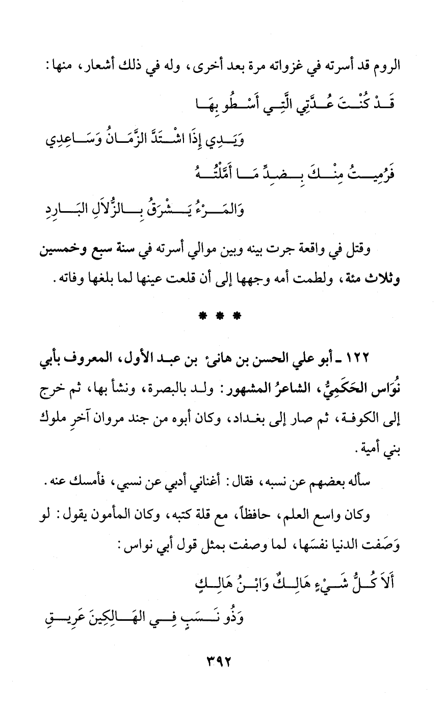 122 - أبو علي الحسن بن هانئ بن عبد الأول، المعروف بأبي نُوَاس الحَكَمِيُّ، الشاعرُ المشهور: ولد بالبصرة، ونشأ بها، ثم خرج إلى الكوفة، ثم صار إلى بغداد، وكان أبوه من جند مروان آخرِ ملوك بني أمية.