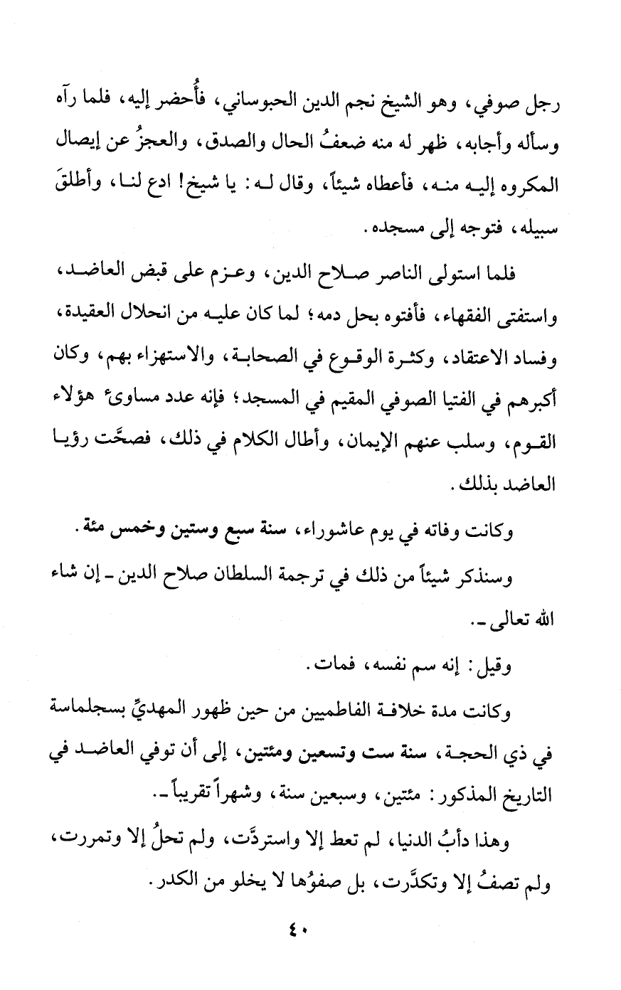 فلما استولى الناصر صلاح الدين، وعزم على قبض العاضد، واستفتى الفقهاء، فأفتوه بحل دمه؛ لما كان عليه من انحلال العقيدة، وفساد الاعتقاد، وكثرة الوقوع في الصحابة، والاستهزاء بهم، وكان أكبرهم في الفتيا الصوفي المقيم في المسجد؛ فإنه عدد مساوئ هؤلاء القوم، وسلب عنهم الإيمان، وأطال الكلام في ذلك، فصحَّت رؤيا العاضد بذلك.